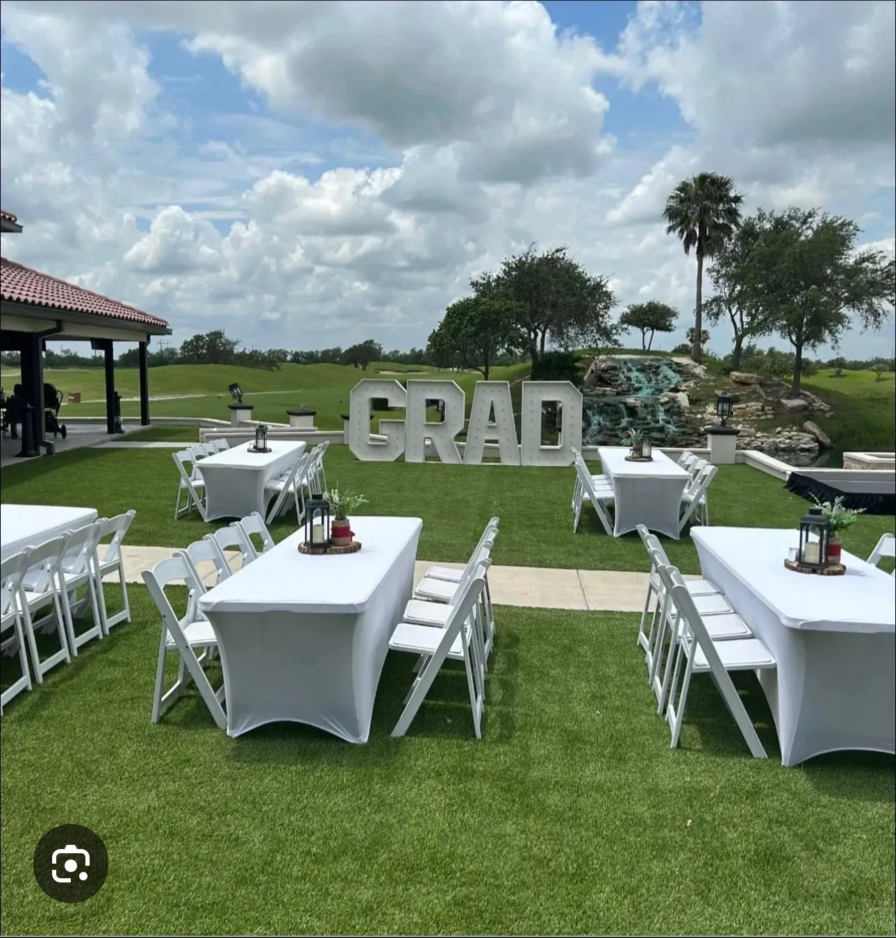 Celebrate your grad in style with Good Vibez Rentals! We provide everything you need for a memorable event—tables, chairs, speakers with a mic for toasts and speeches, and even light-up marquee letters to make a bold statement. Want to showcase their journey? Our giant projector screen is perfect for playing highlight reels and photo slideshows. Let us help you honor your graduate with comfort, style, and unforgettable vibes!